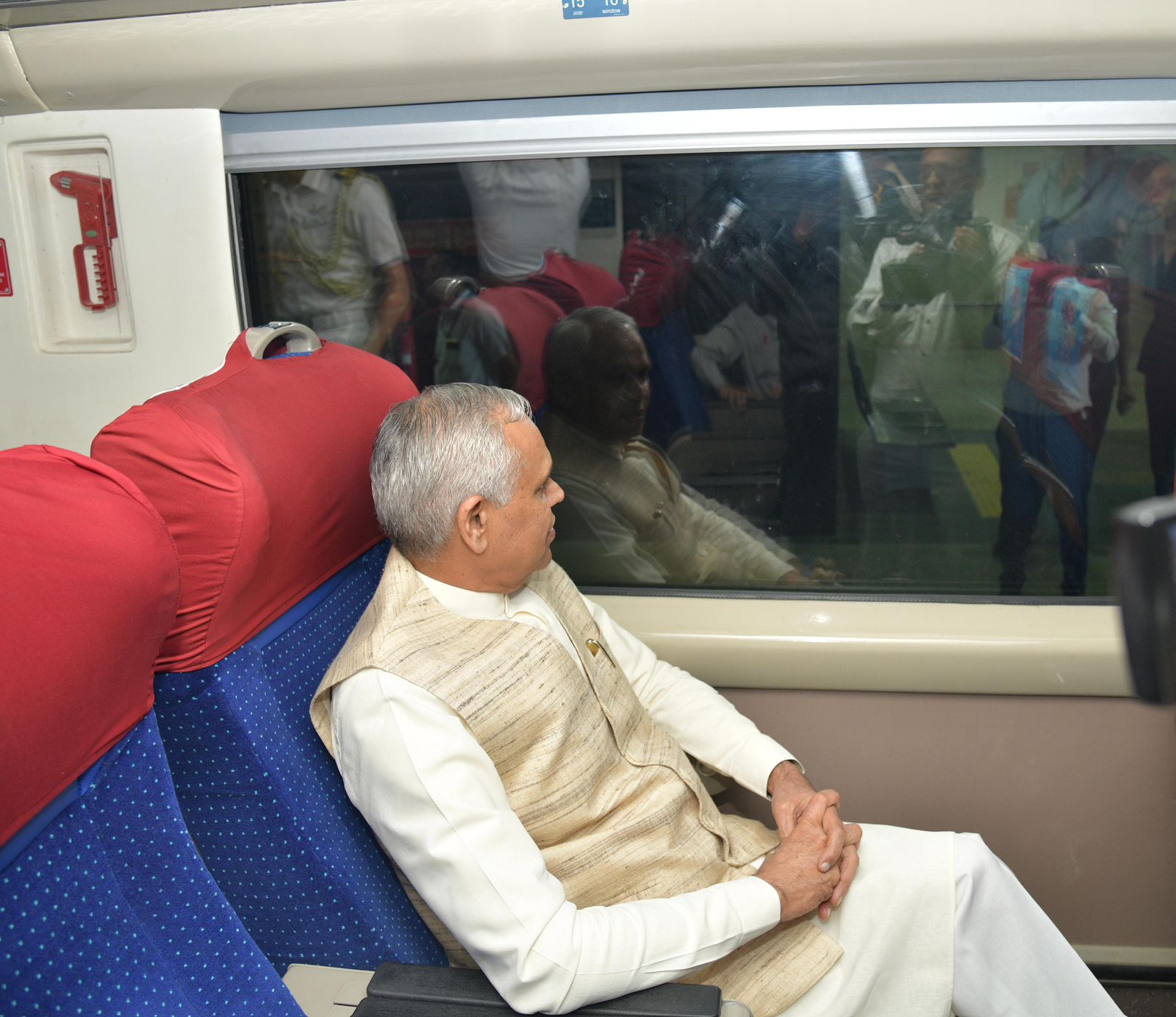 भारत की अत्याधुनिक ट्रेन वंदे भारत एक्सप्रेस में माननीय राज्यपाल श्री आचार्य देवव्रतजी ने गांधीनगर से मुंबई तक की यात्रा की। यात्रा के दौरान उन्होंने यात्रियों से आत्मीयता के साथ बातचीत की और वंदे भारत एक्सप्रेस जैसी आधुनिक रेल सेवा के अनुभव को सराहा।