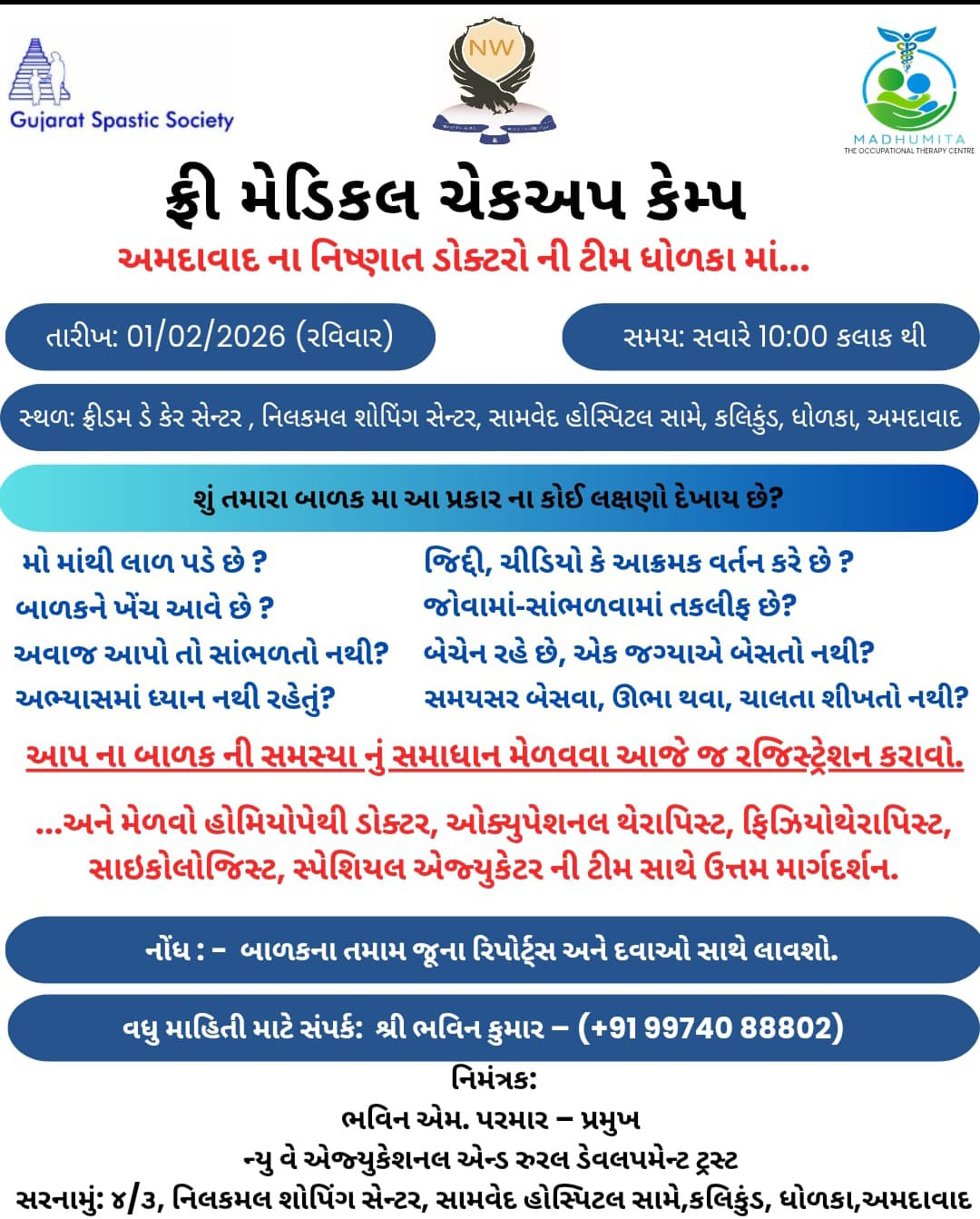 - धोलका में बौद्धिक दिव्यांग बच्चों के लिए निःशुल्क जांच एवं मार्गदर्शन शिविर का आयोजन