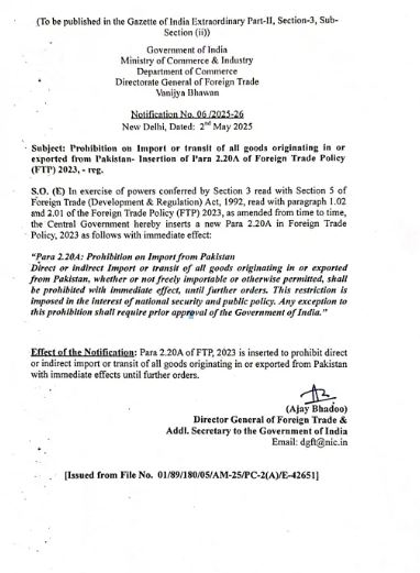 भारत ने पाकिस्तान से आने वाले सभी सामानों के आयात (इंपोर्ट) पर रोक लगा दी है। सरकार ने शनिवार को नोटिफिकेशन जारी किया है। इसमें कहा गया कि इस बैन से किसी को छूट चाहिए तो सरकार से परमिशन लेनी होगी।