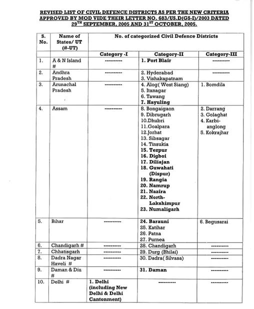 दरअसल, मिनस्ट्री ऑफ होम अफेयर्स ने देश के कुल 35 राज्य और केन्द्र शासित प्रदेशों में 259 सिविल डिफेंस डिस्ट्रिक्ट बनाए हैं। जरूरी नहीं ये सिविल डिफेंस डिस्ट्रिक्ट सामान्य एडमिनिस्ट्रेटिव डिस्ट्रिक्ट हों। जैसे -