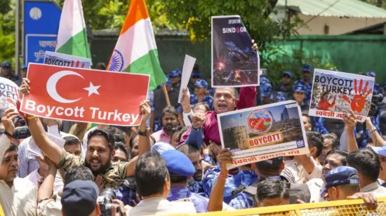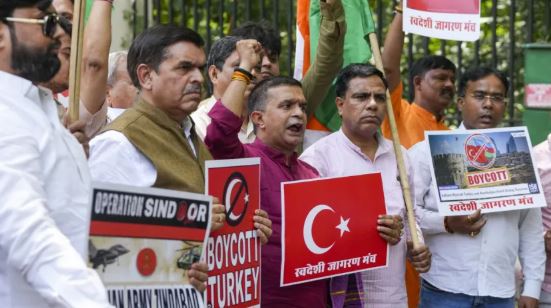 तुर्की का विरोध देश में बढ़ता ही जा रहा है। एशिया की सबसे बड़ी फल और सब्जी थोक मंडी, आजादपुर मंडी ने तुर्की से सेब के आयात को बंद करने का फैसला किया है। तुर्की का हाल में हुए संघर्ष में पाकिस्तान के साथ खुलकर आना भारत में किसी को रास नहीं आ रहा है। तस्वीर में आप स्वदेशी जागरण मंच के कार्यकर्ताओं को तुर्की का विरोध करते देख सकते हैं। आज राजधानी दिल्ली में कन्फेडरेशन ऑफ ऑल इंडिया ट्रेडर्स यानी कि CAIT द्वारा आयोजित राष्ट्रीय व्यापार सम्मेलन में देशभर से आए 125 से अधिक शीर्ष व्यापारिक नेताओं ने सर्वसम्मति से यह संकल्प लिया कि भारत का व्यापारिक समुदाय तुर्की और अजरबैजान के साथ हर प्रकार के व्यापार एवं व्यावसायिक संबंधों का पूर्ण बहिष्कार करेगा, जिसमें यात्रा और पर्यटन भी शामिल है। तुर्की का विरोध देश में बढ़ता ही जा रहा है। राष्ट्रीय व्यापार सम्मेलन में यह भी निर्णय लिया गया कि कोई भी कॉरपोरेट हाउस तुर्की और अज़रबैजान में अपने उत्पादों के प्रमोशन की शूटिंग नहीं करेगा। व्यापारिक समुदाय ने भारतीय फिल्म उद्योग से अपील की है कि वे तुर्की और अजरबैजान में किसी भी प्रकार की फिल्म की शूटिंग न करें, और यदि कोई फिल्म वहां शूट होती है, तो व्यापार जगत और आम जनता ऐसी फिल्मों का बहिष्कार करेगी। सोशल मीडिया पर भी जमकर तुर्की के बॉयकॉट की अपील हो रही है।
