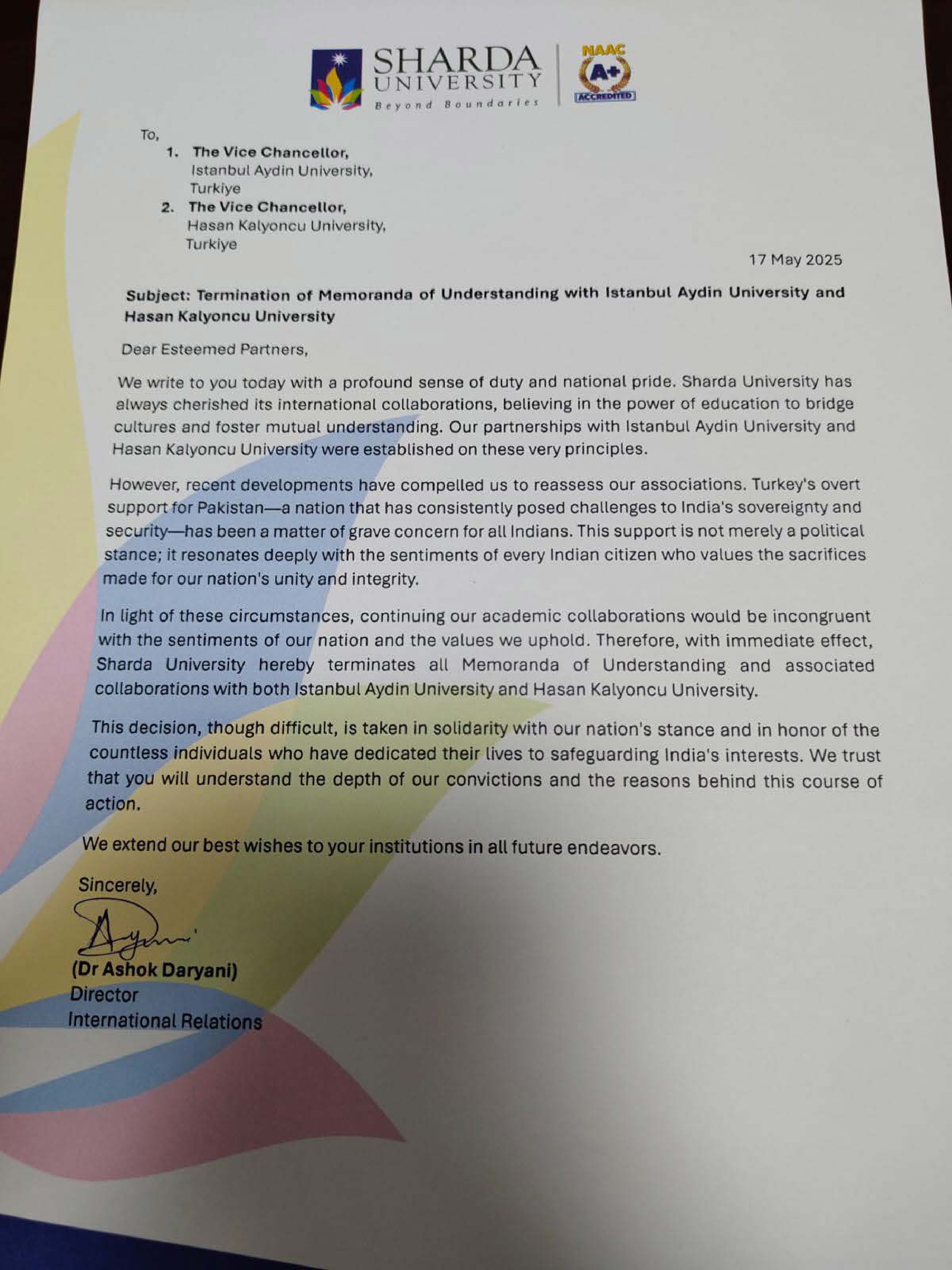 बता दें कि इससे पहले जामिया, जेएनयू और एलपीयू ने भी तुर्की का बायकॉट किया था। जुलाई से नया सेशन शुरू होने वाला है लेकिन अब शारदा के साथ तुर्की की यूनिवर्सिटी की एजुकेशनल पार्टनरशिप नहीं होगी। ऑपरेशन सिंदूर के बाद देशभर में तुर्की के खिलाफ अभियान चल रहा है।