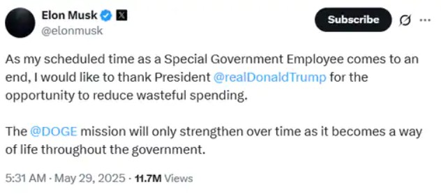 मस्क ने कहा कि स्पेशल गवर्नमेंट एंप्लायी के तौर पर मेरा समय पूरा हुआ। उन्होंने इस जिम्मेदारी के लिए अमेरिकी राष्ट्रपति ट्रम्प को धन्यवाद भी दिया।
